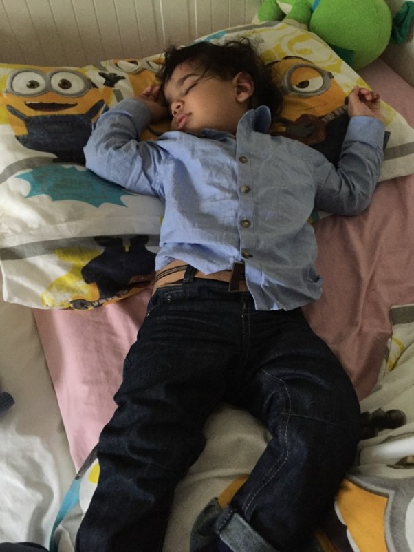 I thought, let me see if he’ll go back to his own bed, he’ll sleep then… So after some cuddles and persuasion I managed to get him to his bed, but would he let me go? NOOOO…..